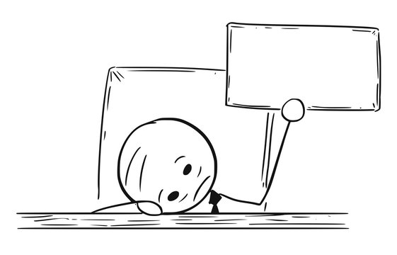 Cartoon Stick Man Drawing Conceptual Illustration Of Depressed Tired Or Overworked Businessman With Head On The Table And Empty Or Blank Sign Concept Of Burning Out Or Problems And Troubles Stock Vector